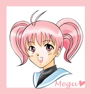 パスで主線を描きました。そのくせ髪の毛のカーブががたがたなのは修行が足りないから(とほほ)。緒方さん目当てで見始めた探偵学園Qですが、メグは結構お気に入りです。かわいいじゃないっすか。Qの髪型はちょっと難しすぎ(笑)しかし、この人もアホ毛つきなのね…。こちらもフォトショ使用です